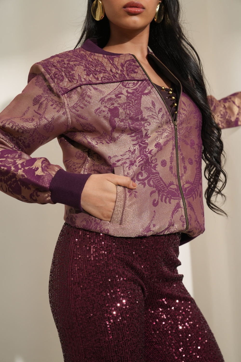 Navy Blue Floral Swirl Design Brocade Bomber Jacket