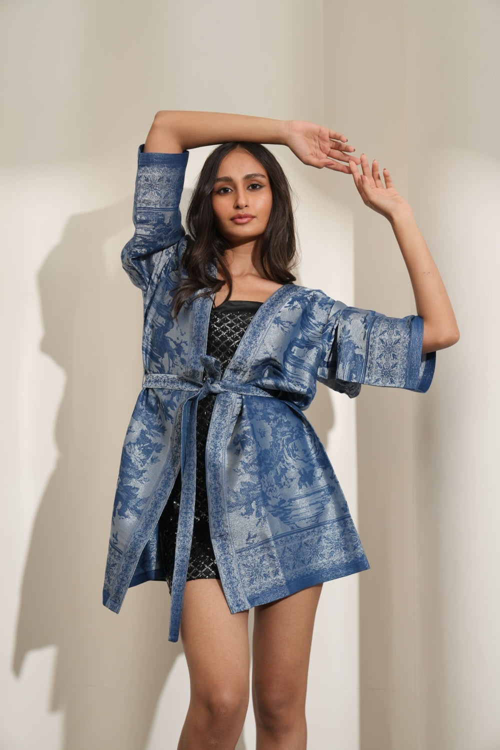 Denim Blue Floral Design Brocade Kimono Set - XS-S / S / Black