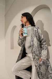 Black Colored Floral Designed open front jacket, has a lapel collar, 2 pockets, has a button closure, long sleeves, curved hemline, cotton lining