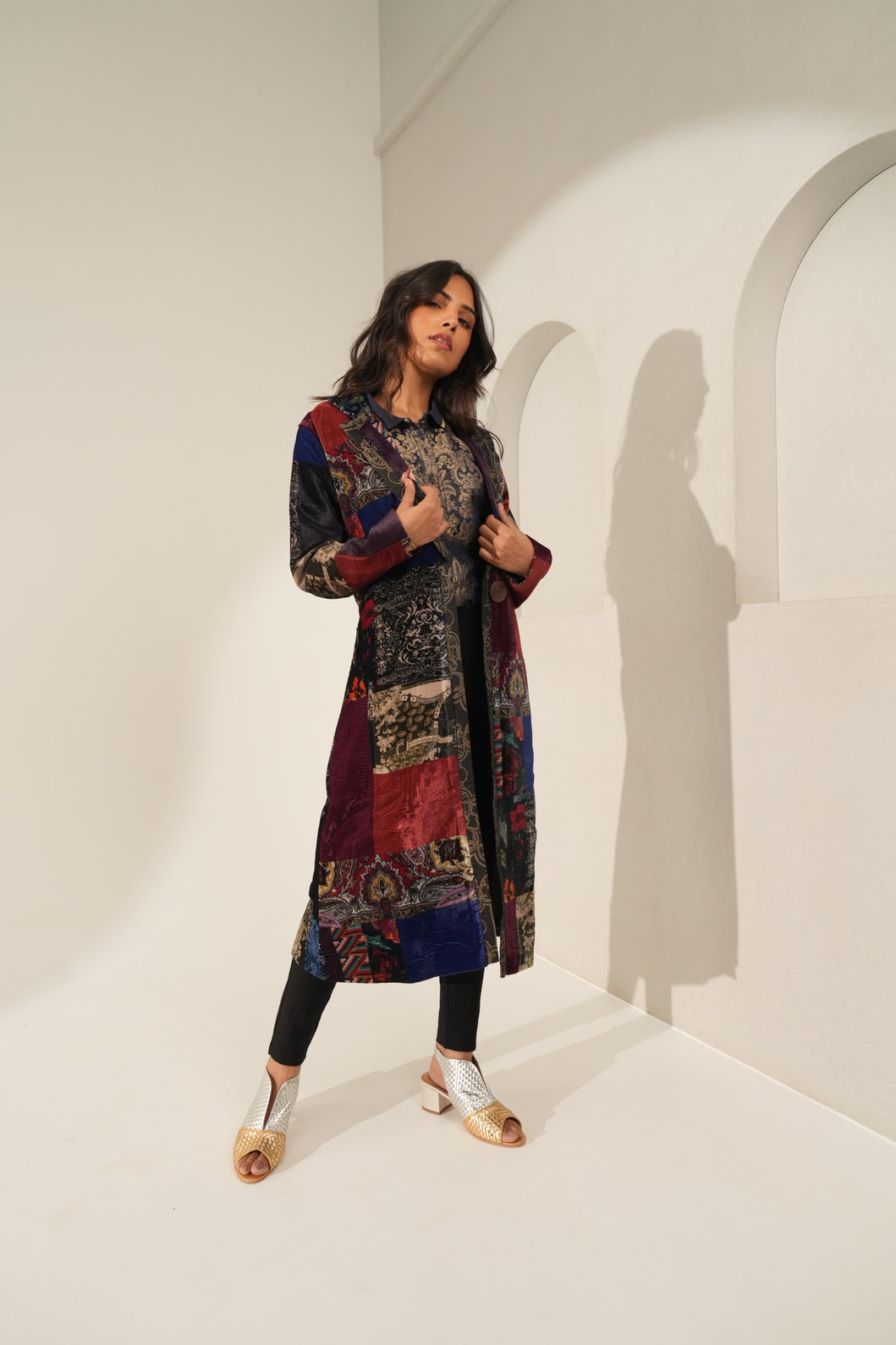Multicoloured patchwork printed open front jacket, has a lapel collar, 2 pockets, has a button closure, long sleeves, curved hemline, cotton lining