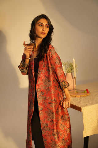 Red Floral Designed Brocade Metallic Long Blazer Sale