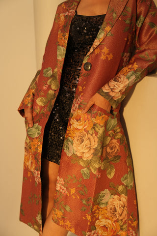 Grey Colored Floral Designed open front jacket, has a lapel collar, 2 pockets, has a button closure, long sleeves, curved hemline, cotton lining
