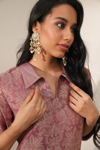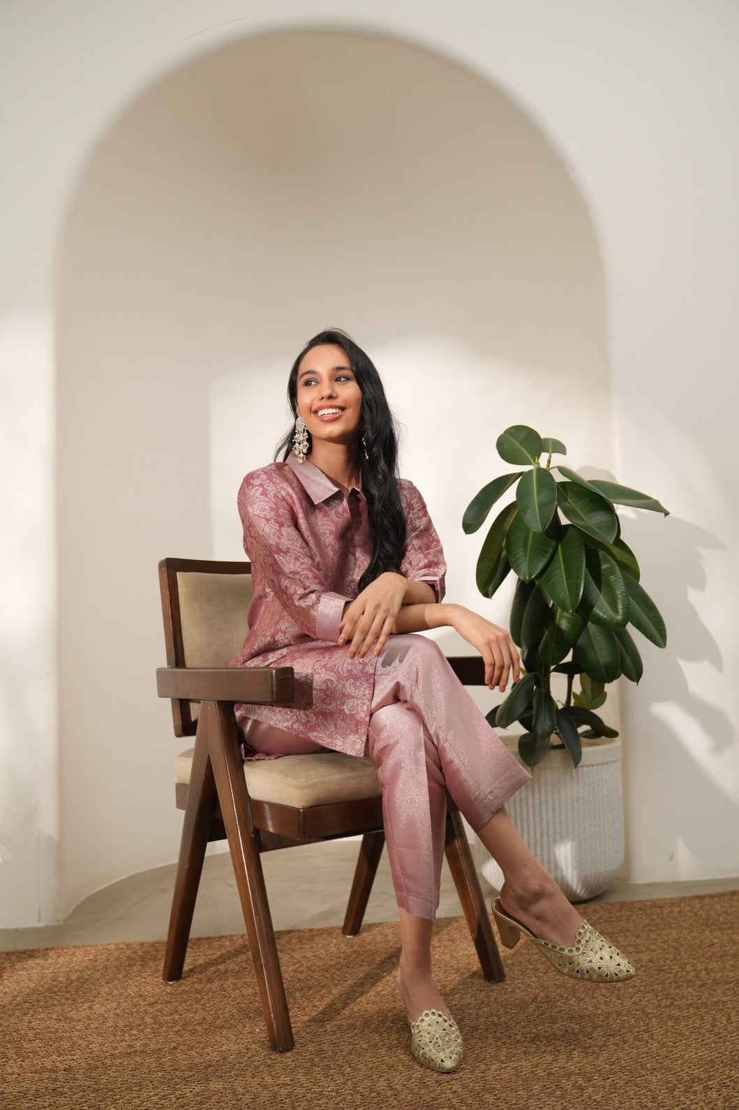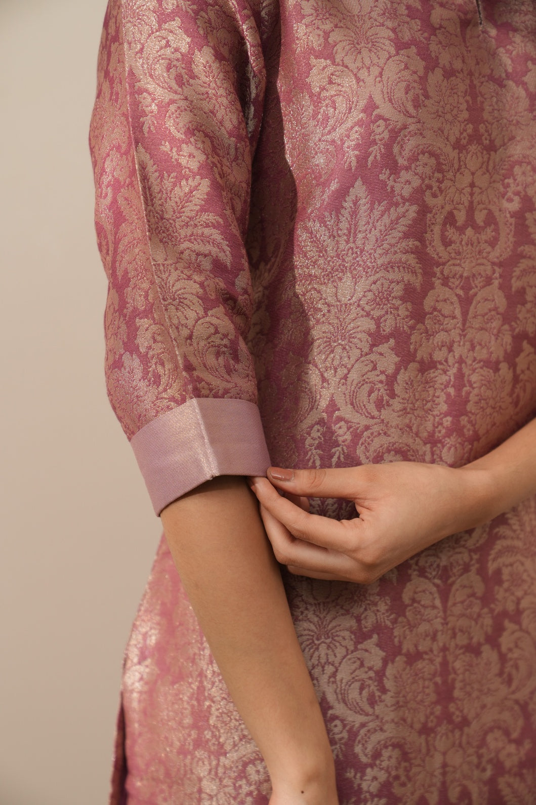 Coral Gold Silver Mix Color Tapestry Designed Brocade Kurta with Brocade Metallic Matching Pant