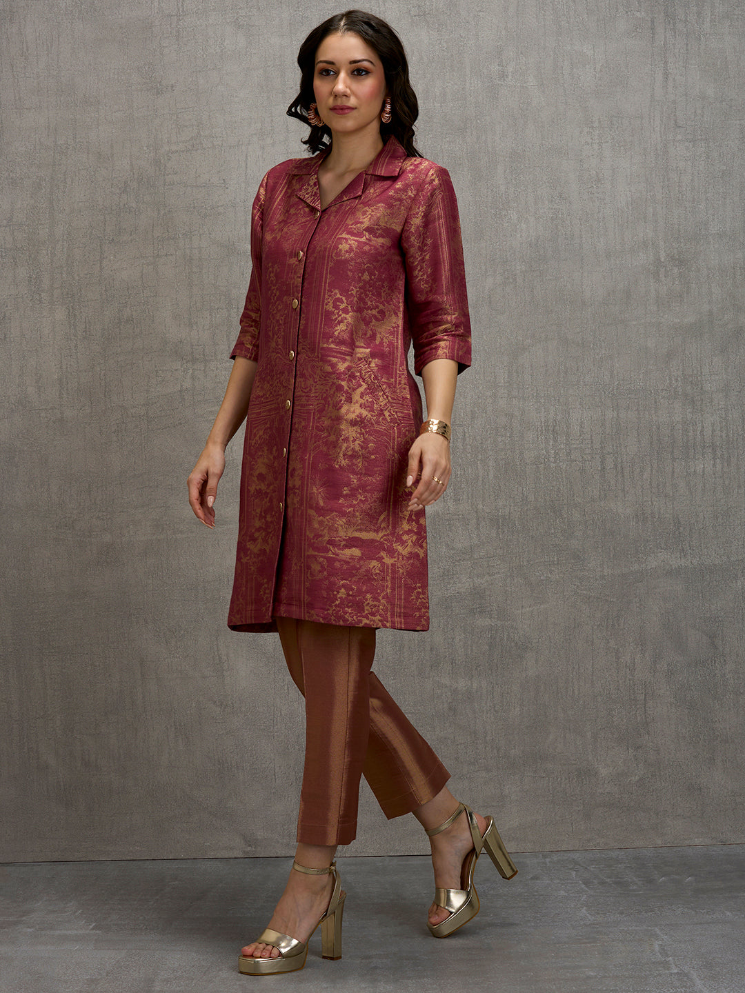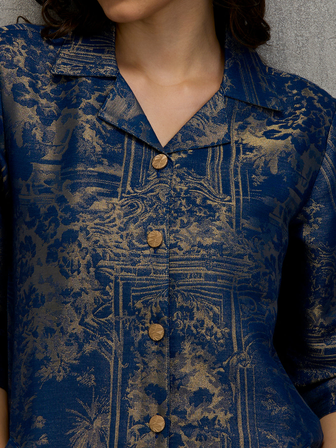 Brocade Denim Blue Placed Design Button up Tunic Kurta - S / Coral