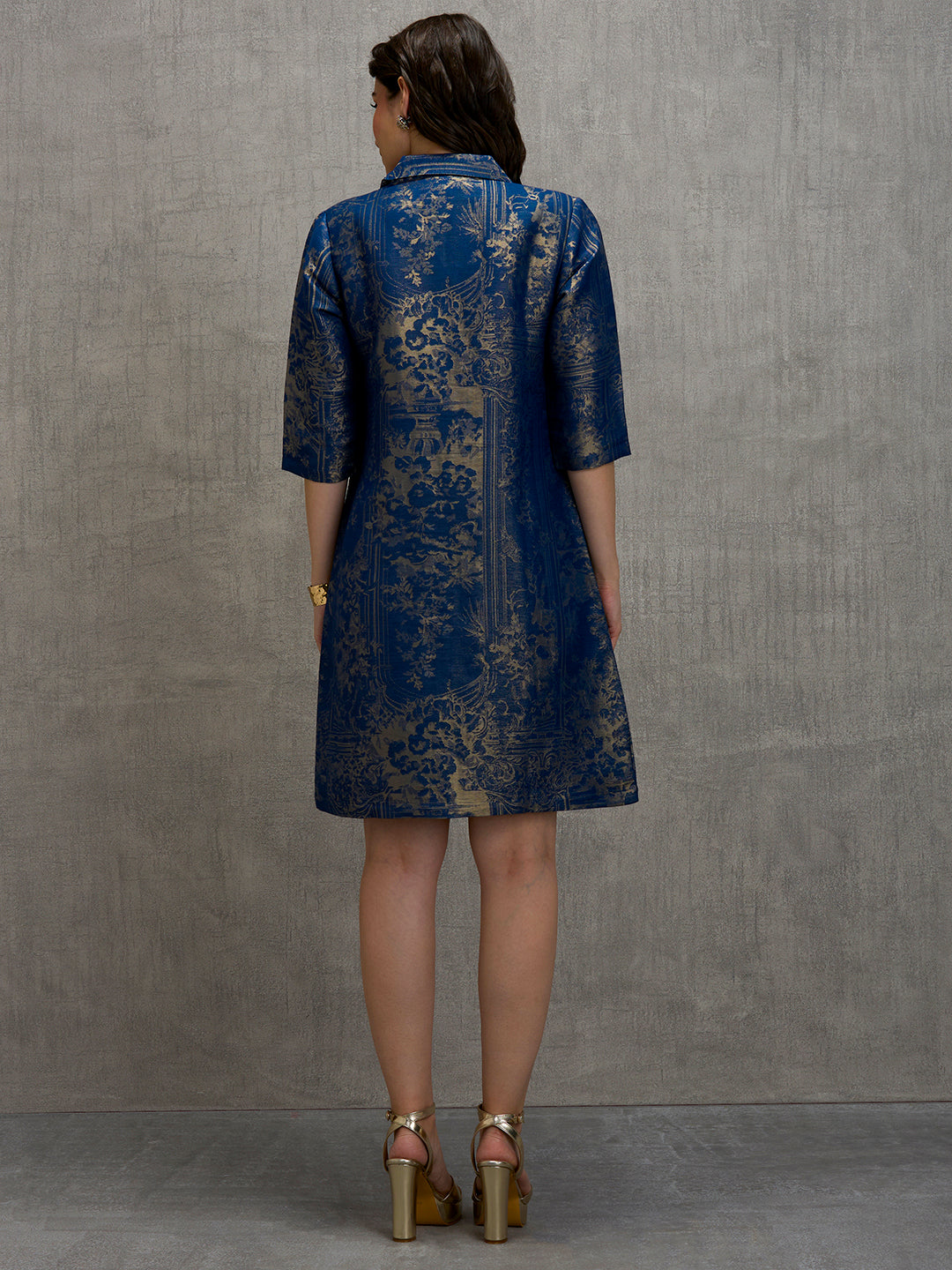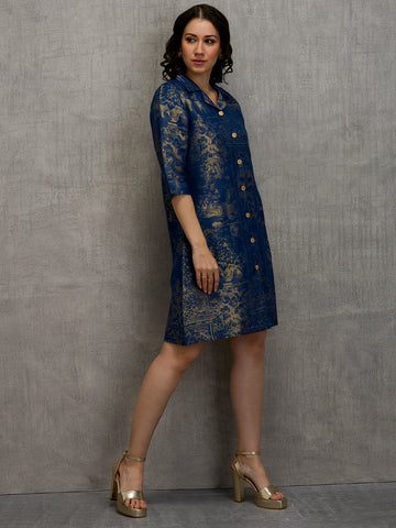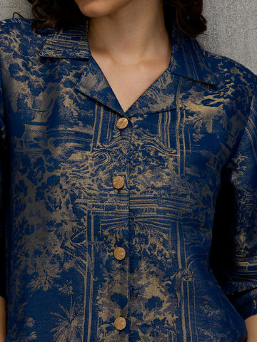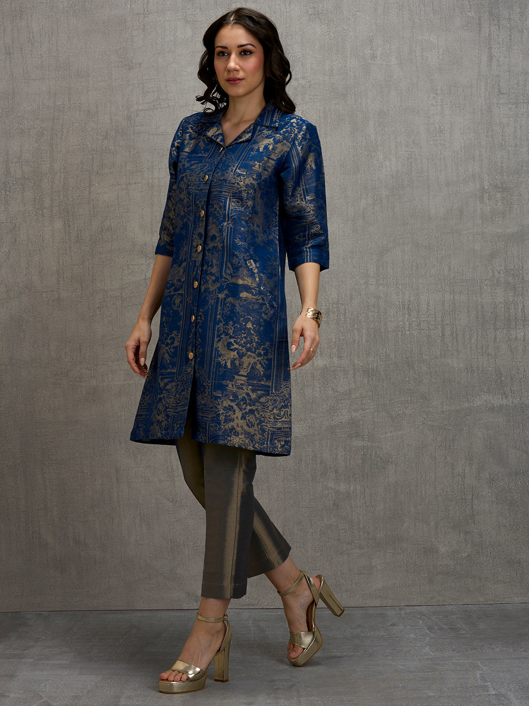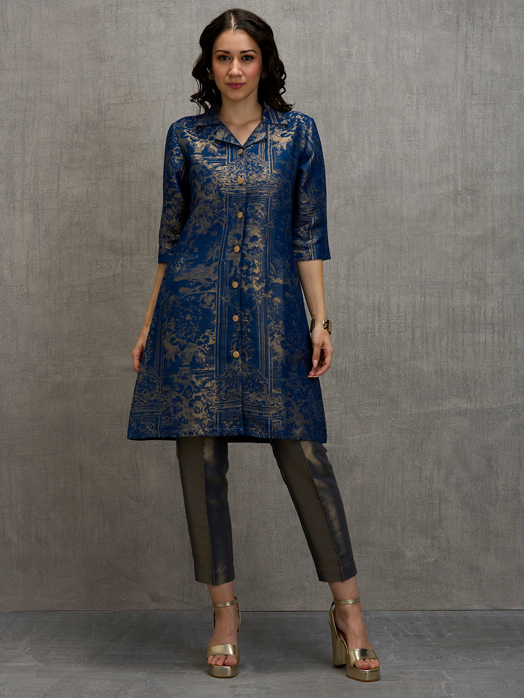 Brocade Denim Blue Placed Design Button up Tunic Kurta Sale
