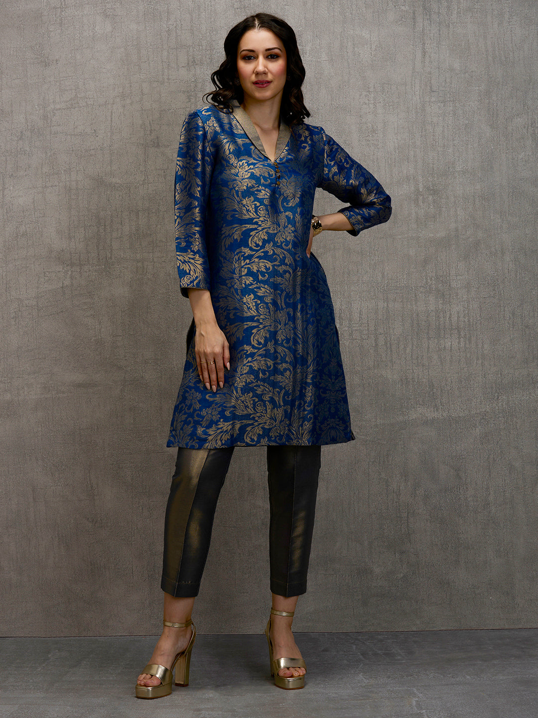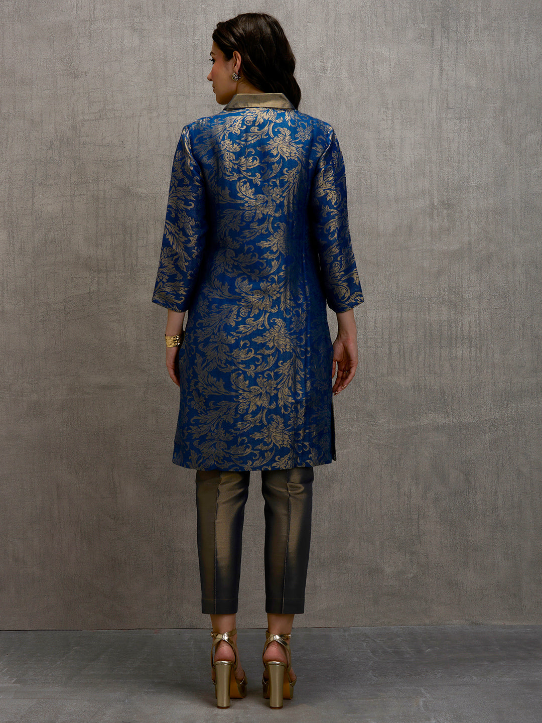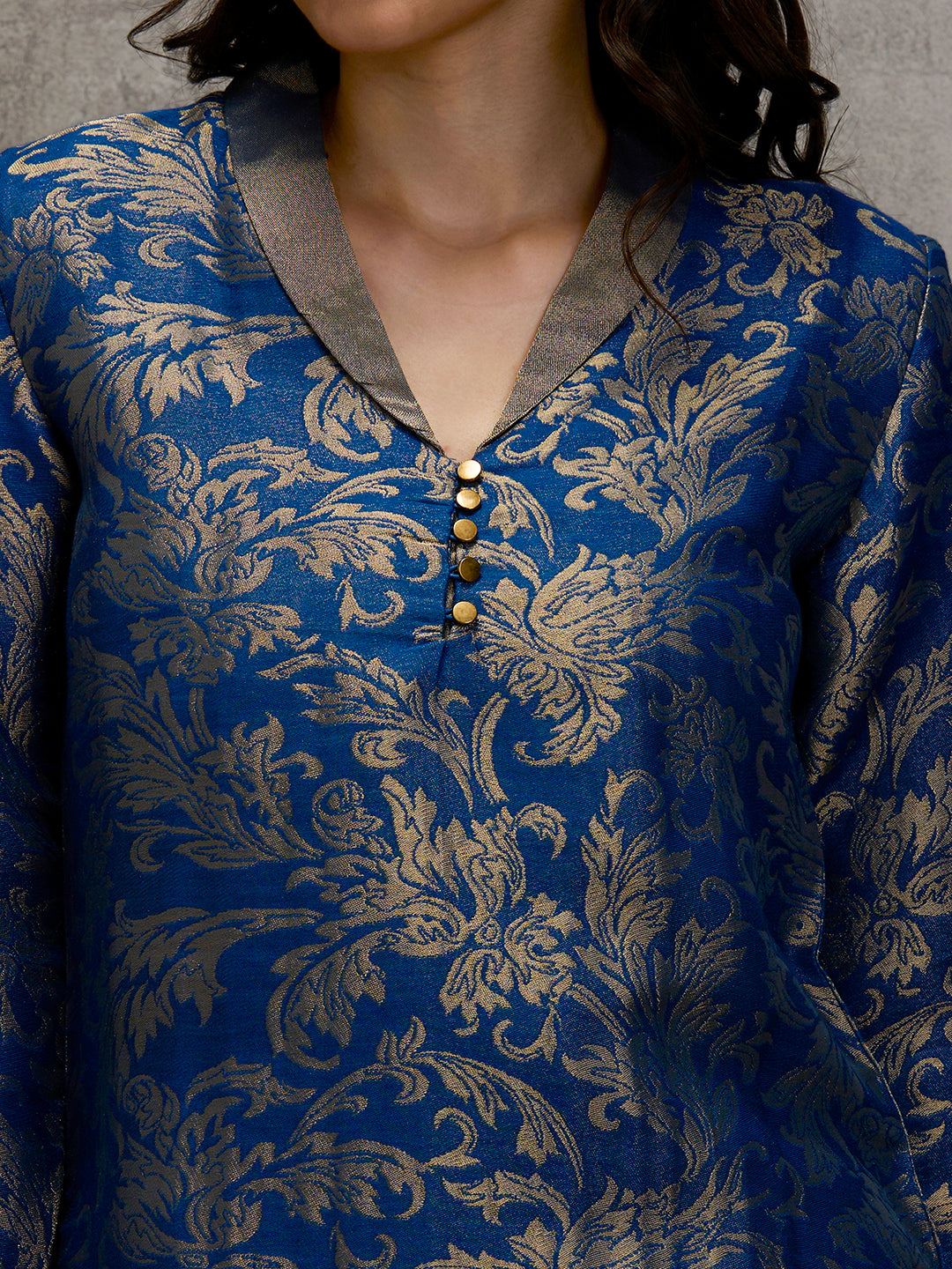 Blue swirl design brocade kurta set ideal for refined ethnic and festive occasions.