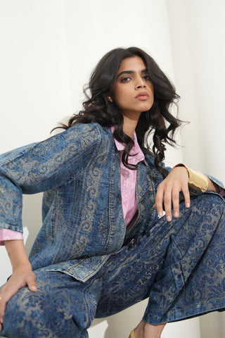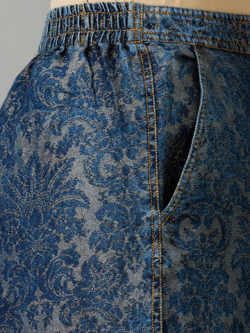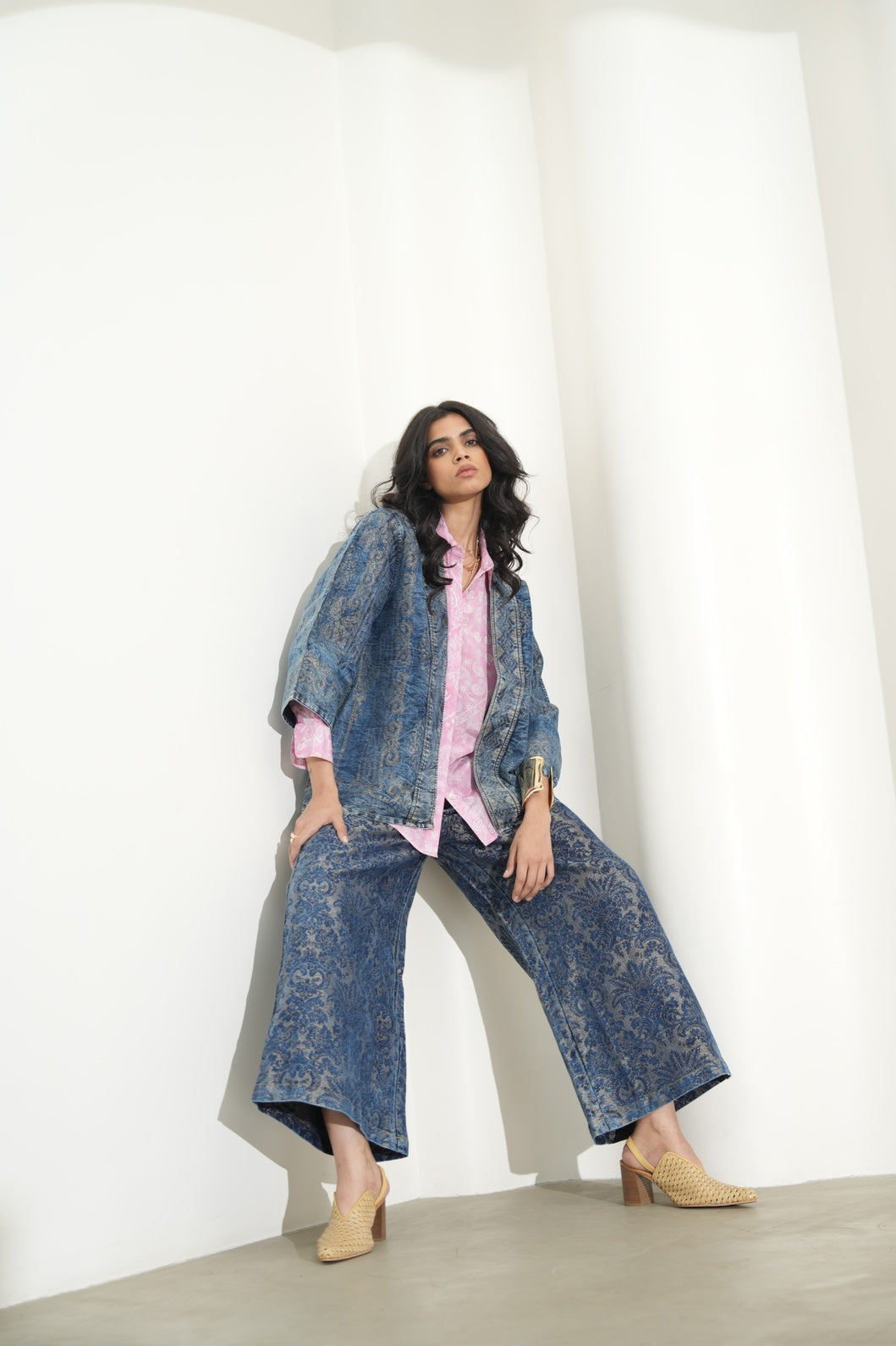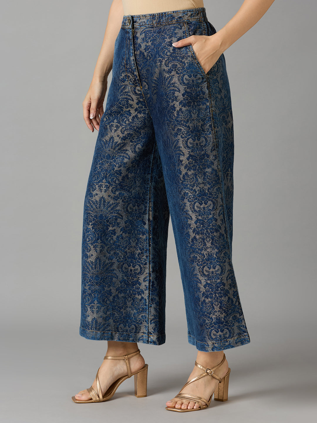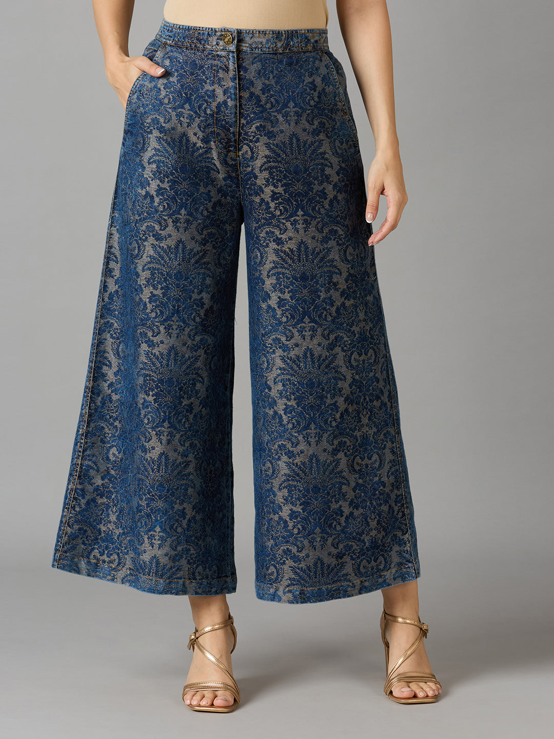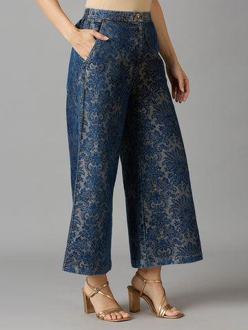 Denim metallic woven brocade Flare pants with geometric design. Front band with elastic back waist. Front pockets, zipper and button.